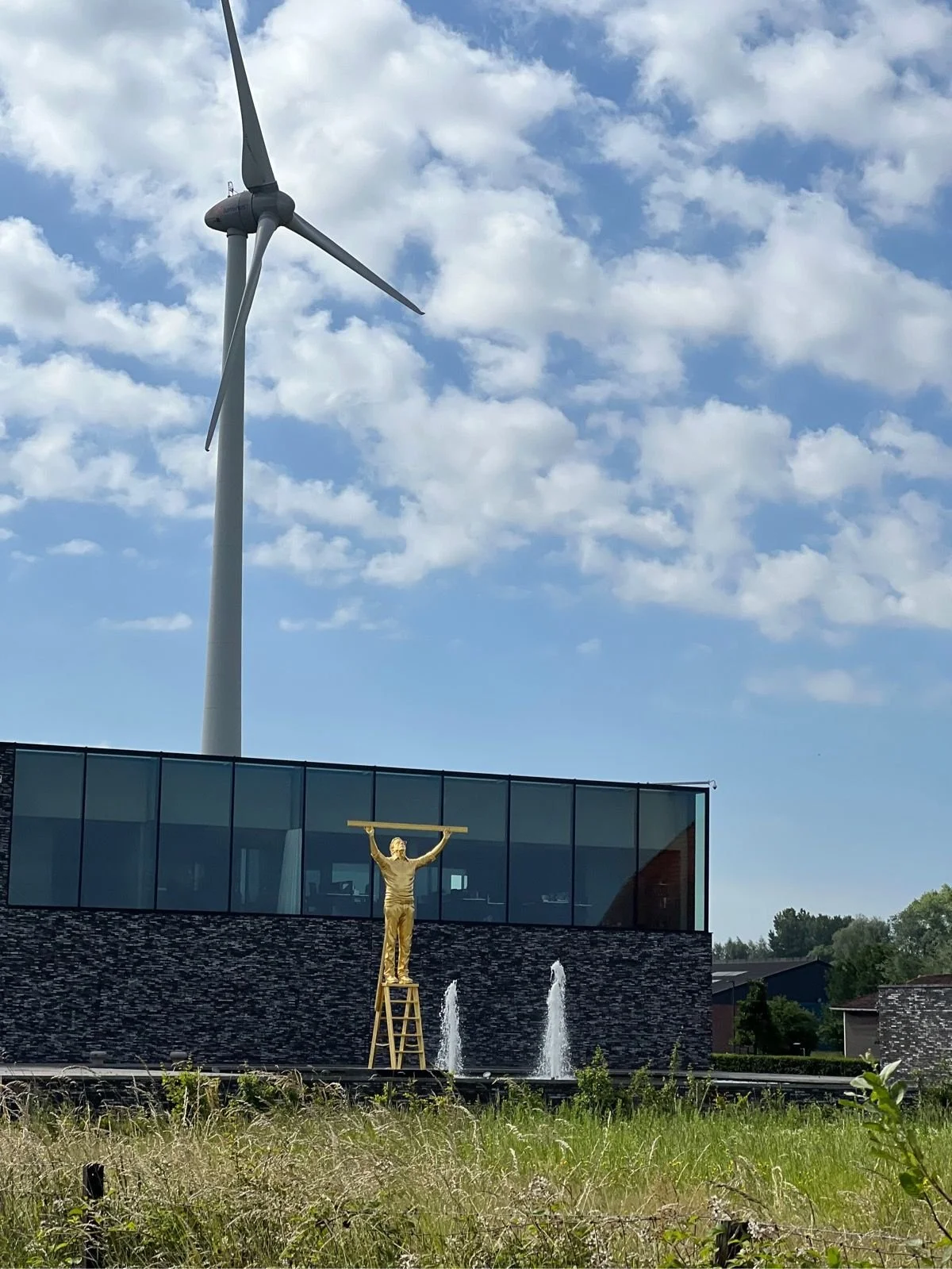 Na de verplichte plaspauze en fotomoment op de parking van deze expohallen zetten we onze tocht verder. Naast de E40 richting Wetteren moeten we immers ook nog het prachtig kunstwerk, de man die de wolken meet, passeren van de omstreden kunstenaar Jan Fabre.
