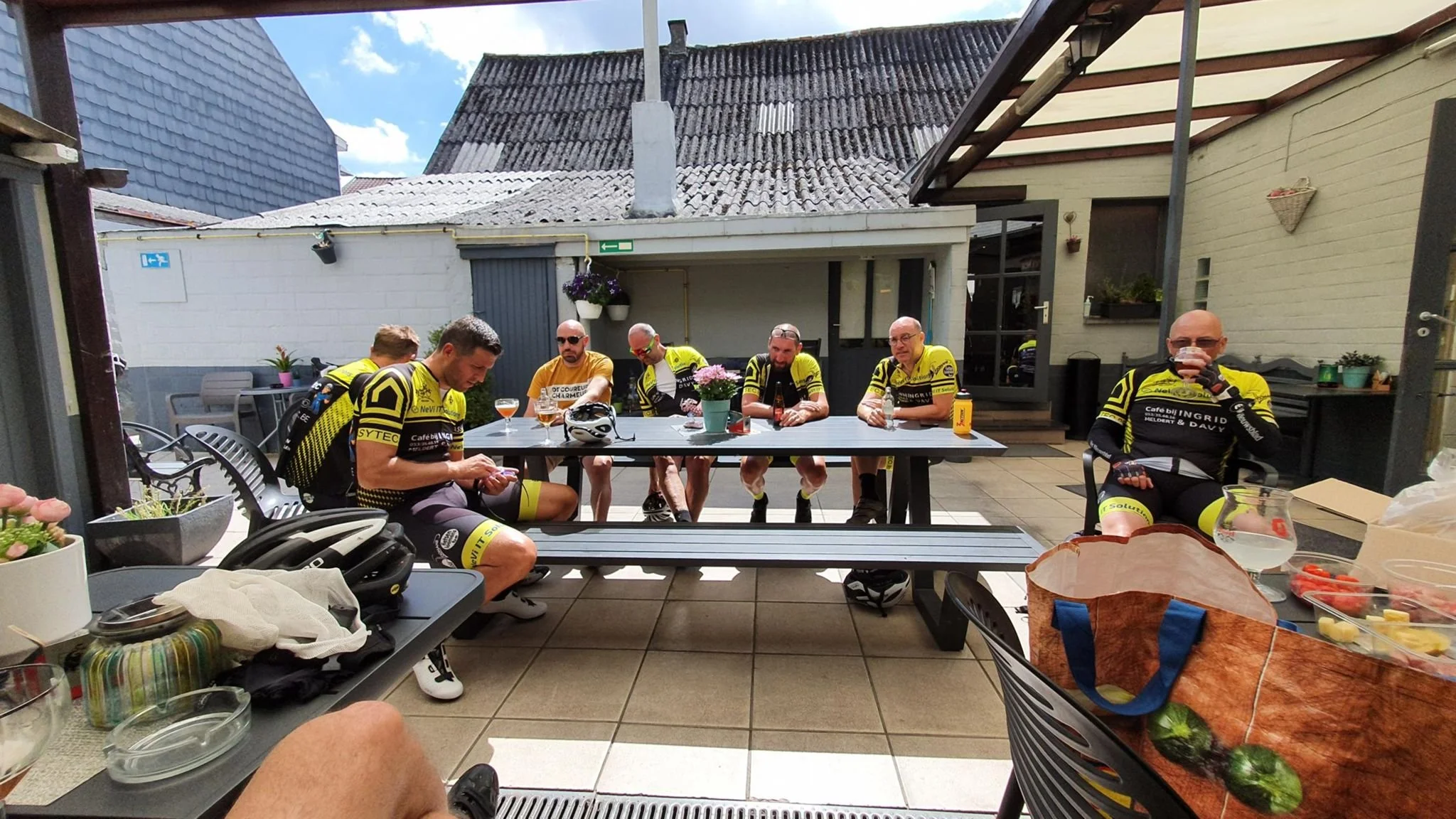Kurt die binnenkort een kijkoperatie moet ondergaan aan de knie, kon het op deze Vaderkesdag niet laten om vrouw en kind thuis achter te laten en zijn geliefde clubje een bezoekje te brengen. Kurt zal trouwens volgende week ook David vergezellen in de volgwagen tijdens onze langste rit.