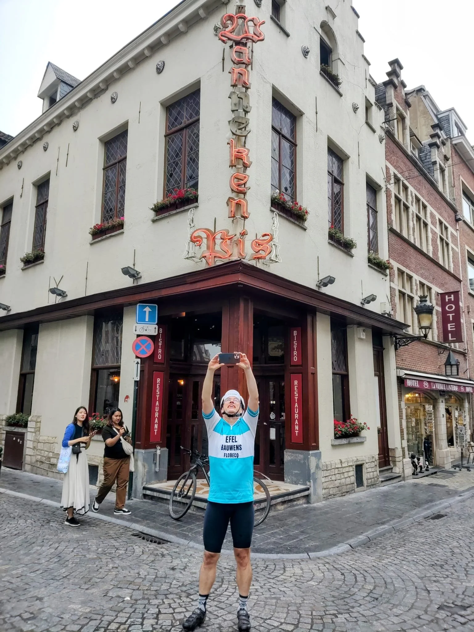 De stralende zon die ons beloofd was, bleef achterwege en de vochtige mist zorgde hier en daar voor een spatje vuil op onze prachtig opgeblonken antikiteiten. Net voor we Brussel binnen reden, kregen we daar nog een patat van een helling voor de wielen. De Scalle zijn vélo die eerder van lood dan van staal gemaakt leek, vergde dan ook het uiterste van zijn geoefende kuiten om hem omhoog te sleuren. Gelukkig volgde kort daarop een korte pauze voor de huizenhoge muurschilderingen van Yvonne en Eddy Merckx. Een eerste obligate fotoronde was een feit. Langs krakkemikkige kasseistraatjes, over “slibbere” tramsporen en recht door het hol van een Eritreese leeuw, reden wij alsmaar dieper onze metropool binnen. Tot we plots voor “Manneke Pis” stonden in al zijn naakte glorie. Gelukkig waren er op dat vroege ochtenduur nog niet te veel toeristen en kon ieder aanwezig lid poseren voor het lid van Manneken P(en)is, dit terwijl Jo nog wat rek-en strekoefeningen aan het doen was om de armspieren los te gooien. Via de Stoofstraat ging het naar de Grote Markt, waar menig schaars geklede influencer, blogster en vlogster naarstig aan het poseren was om het balkon van het Stadhuis in beeld te krijgen samen met hun eigen balkon. Menig toerist keek vol verbazing naar ons fraai uitgedost twaalftal en hier en daar werden we al eens vastgelegd op de gevoelige plaat van een Japanse Shimano-retrofanaat. (prachtige rijm trouwens)