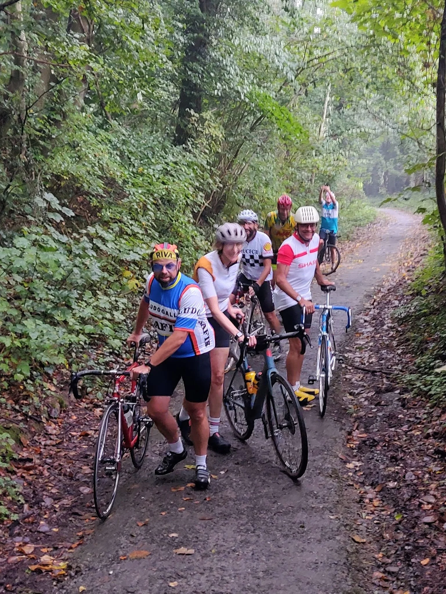 De rest liet dit probleem niet aan zijn retro hartje komen en om 08:30 zette onze antieke trein koers naar Asse-Ter-Heide om vervolgens de Notstraat af te dalen en de eerste helling buiten categorie, de Putberg, aan te vallen. Vermoedelijk nam onze oorlogszuchtige President het aanvallen wat te letterlijk, want halverwege de klim trok hij met zijn dijen als de hespen van een Pata Negra zwijn, zijn achterwiel los uit zijn kader. Nog net voet aan grond zettend, stond hij daar schoon, hierbij al de rest ophoudend. Katrien die net achter hem kwam kon zich ook nog net losklikken en voet aan grond zetten. Jean, ook gekend als de Velodoctoor, kon rap de diagnose stellen dat de as van het wiel te veel naar voor zat in het kader, de ketting te lang was en de voorderailleur moest worden afgeregeld. Kortom, er bleek niet veel goed aan tot de President Jean eraan herinnerde dat hij die vélo voor hem ineen had gestoken. Lik op stuk beleid noemen ze dat in de politiek dacht ik. Als volleerde Flandriens was het vervolgens met de klikpedalen, de vélo voortduwend, de steile helling opklauteren. Het leek wel een scène uit een slechtweer editie van de Ronde Van Vlaanderen. Eens boven op de Putberg herenigd ging het door Asse en Bekkerzeel naar de Waerboom in Bijgaarden en naderden wij alsmaar dichter onze hoofdstad.