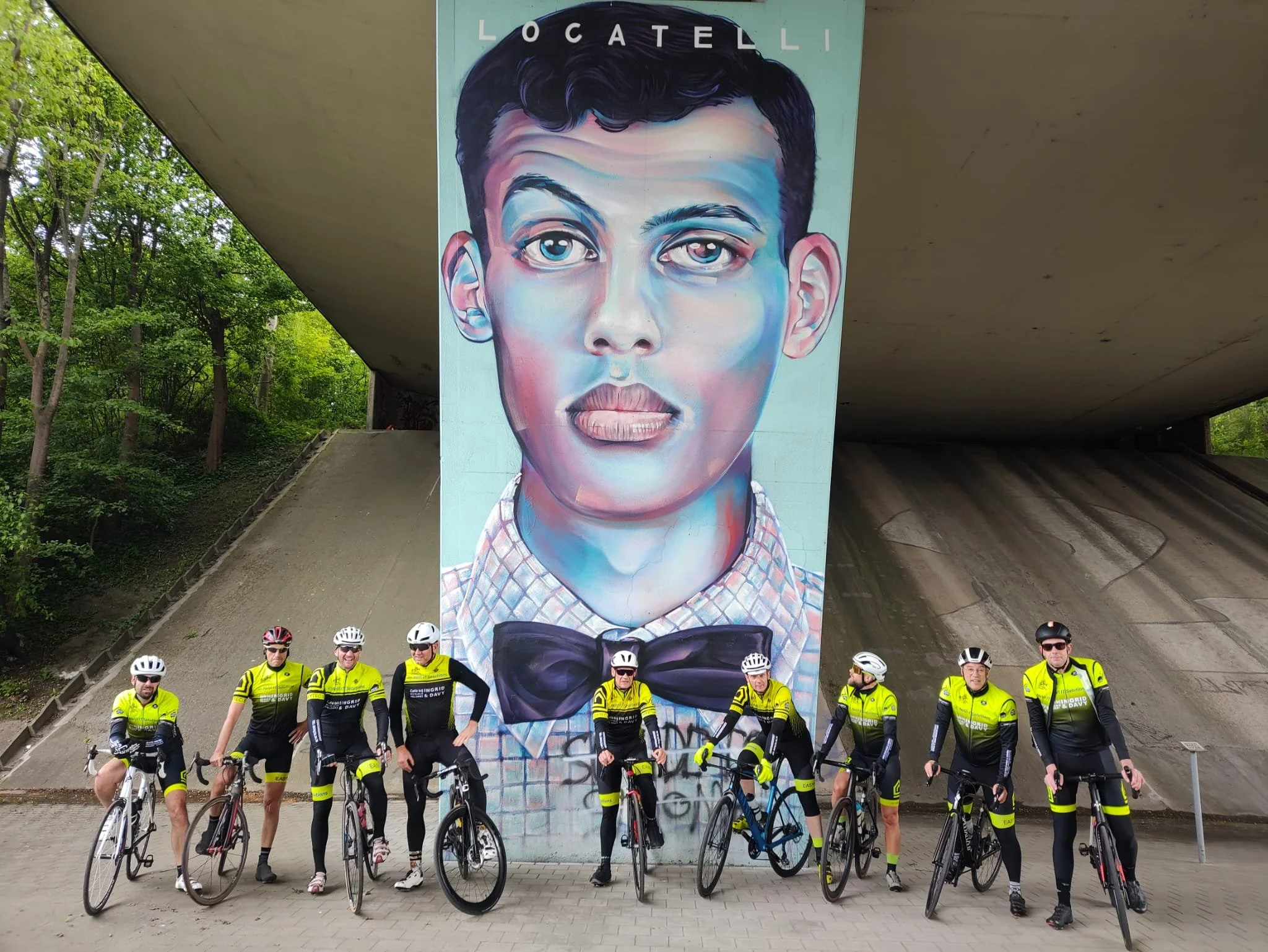 Vooraleer we door de vroege, zondagse drukte van Brussel moesten, hielden we even halt aan een prachtige muurschildering van Locatelli die de Maestro oftewel Stromae afbeeldt. De graffiti-artiest Locatelli heeft trouwens ook een paar muurschilderingen gemaakt aan de carnavalshallen van Aalst, dit geheel terzijde en ten behoeve van de cultuursponzen onder de lezers. Slingerend door de volkse wijken van Anderlecht bereikten wij het kanaal, het enige vlakke stuk in het parcours, ware het niet dat hier de wind vol op de kop stond. Maar nog hadden Jimmy en Kris niet genoeg van het beukwerk. Plichtbewust bleven zij de veel te strakke wind in twee splijten zodat de rest achter hen redelijk comfortabel zat. Het wegdek van het jaagpad tussen Anderlecht en Ruisbroek is echter van dien aard dat het amper geschikt is voor koersfietsen. Zandophopingen, putten, gravel, slechte kassei, alles hebben ze daar gebruikt om het de fietser zo onaangenaam mogelijk te maken. Gelukkig werden we even verstrooid door de roeiers op het kanaal, te water gegaan aan de Anderlechtse Regatta Club en ook de zon brak er ondertussen door.