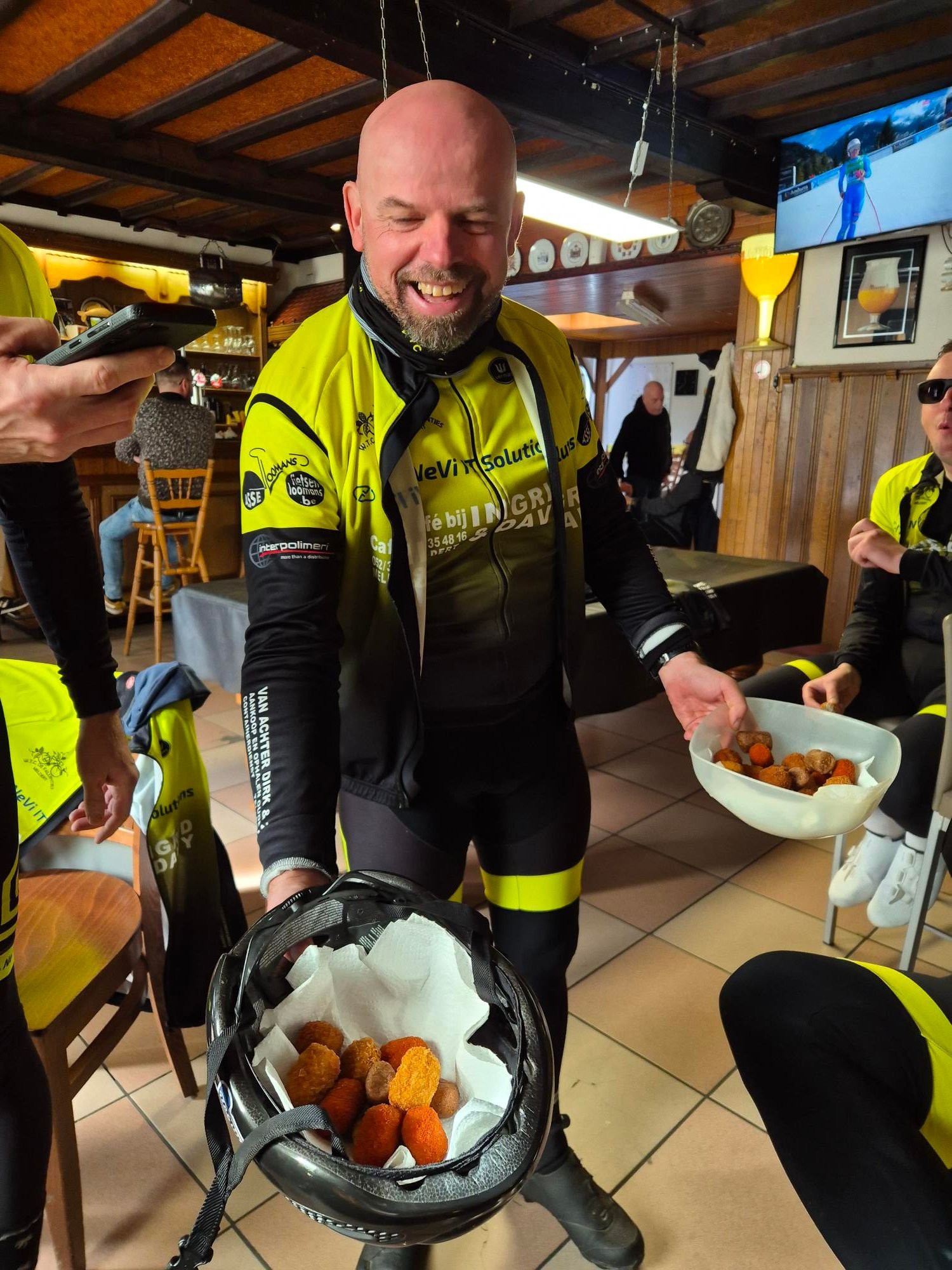 Bij aankomst spoedde Jo zich rap naar huis om een lading diepgevroren frituurhapjes, of waren het gefrituurde diepvrieshapjes, op te halen? In ieder geval is de President niet alleen een begenadigd DJ, hij kan ook met de friteuse overweg. En na een tiental minuten serveerde hij hete hapjes uit zijn koershelm. Ons misschien nieuw lid, Thierry keek zijn ogen nogal uit bij zijn debuut. Hopelijk stimuleert zo veel gezelligheid hem nog meer om zijn handtekening op de lidkaart te zetten.
