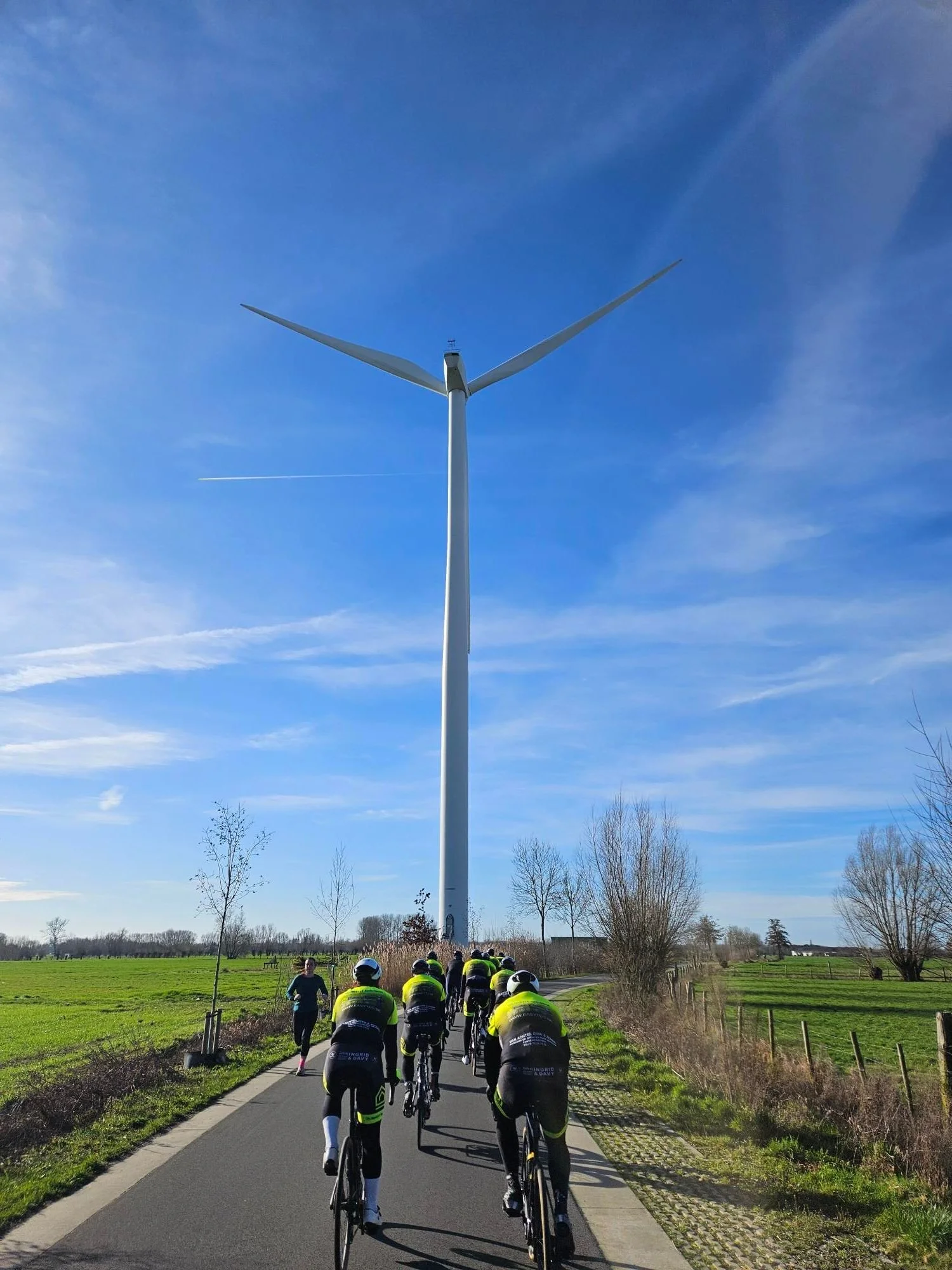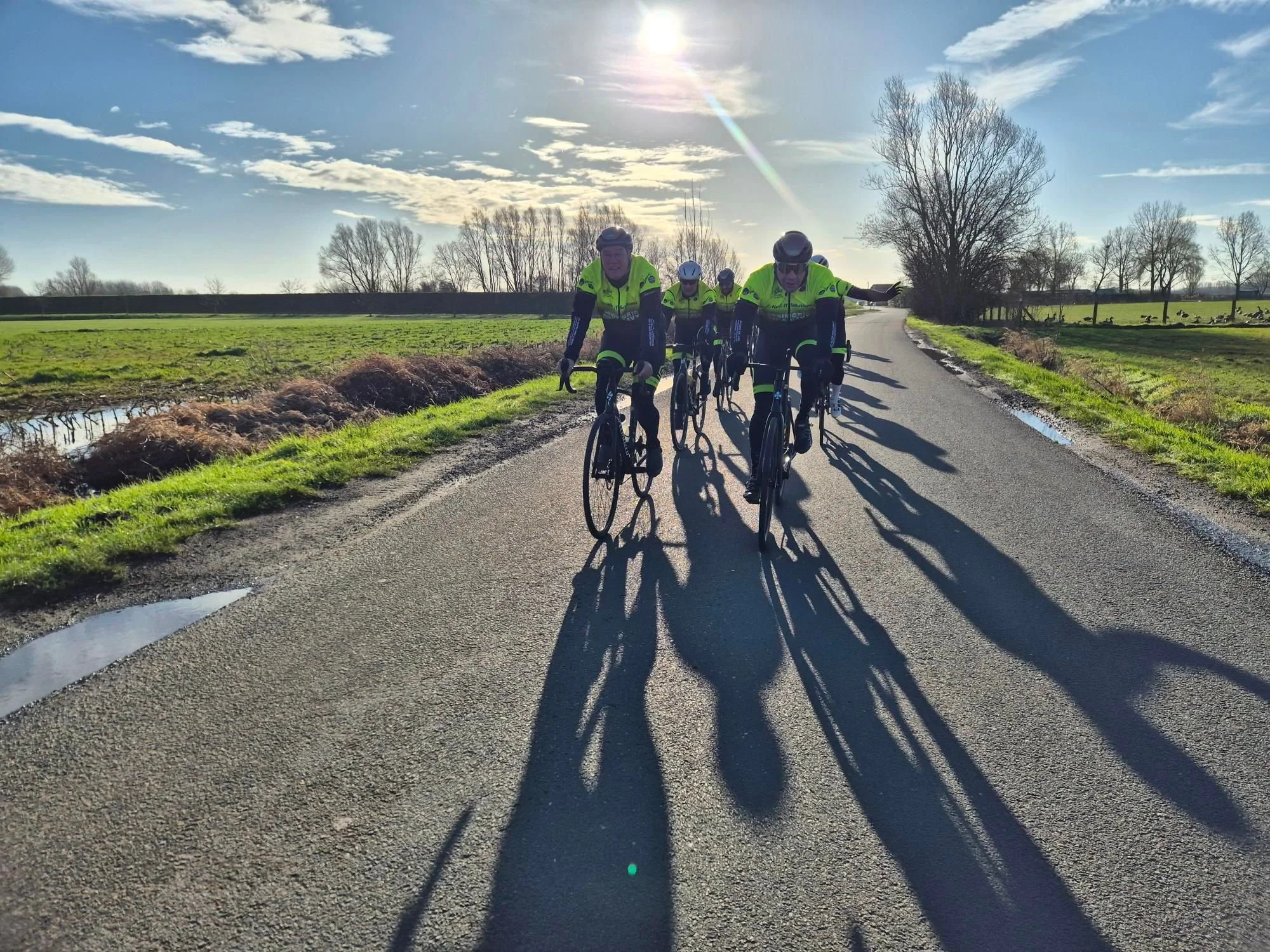 Traditioneel is de proloog van ons seizoen een vlakke rit die ons deze keer naar de Zeelse polders naast de E17 bracht. De heenweg was een pleziertochtje want de wind blies krachtig in de rug. Eens de kaap van de autosnelweg gerond was het echter andere Zeelse koek, een stevige bries vol op de freter en hier en daar ontsnapte al een protje van tussen het broekzeemleer. Maar geen nood, Bill en Peter, zetten zich samen op kop en zetten de rest kilometerslang uit de wind, allez vooral Bill dan, want Peter staat zodanig scherp dat de wind er losdoor waait. Jos probeerde het tempo de hoogte in te jagen door zoals vanouds een honderdtal meter voor ons kleine peloton uit te rijden. Uiteraard trapte niemand nog in zijn val en bleef de rest schoon het opgelegde tempo aanhouden zodat Jos de nutteloosheid van zijn poging inzag en zich weer liet opslokken door de gapende muil van de groep. En gapen werd er gedaan, zo een saaie rit! Neen, alle gekheid op een stokje, parcoursbouwer Jo had voor een knappe eersteling gezorgd.