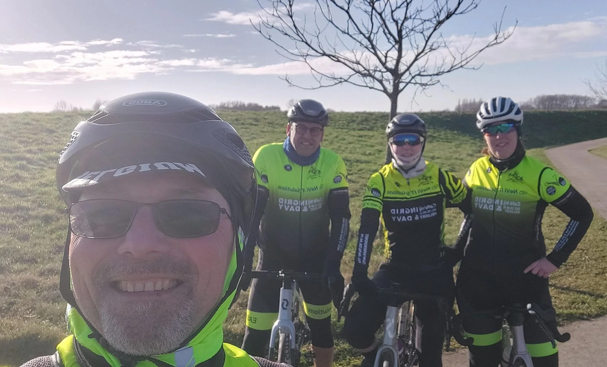 Naast de vele afzeggingen, was er ons ook nog ander slecht nieuws ter ore gekomen. Onze nieuwe uitrusting die wij bestelden bij Vermarc, kon niet tijdig geleverd worden zodat wij bij de start niet in onze prachtige jubileum uitrusting zouden kunnen pronken. Maar geen nood, de levering zou halverwege maart een feit moeten zijn. En onze fluopakjes mogen ook nog gezien worden en onder een fris lentezonnetje doken toch 16 gezonde leden op. Althans, Dirk was er wel maar deelde onmiddellijk mee dat hij zich ook niet opperbest voelde en dat hij voor de korte etappe ging kiezen, samen met Els, Yentl en André.