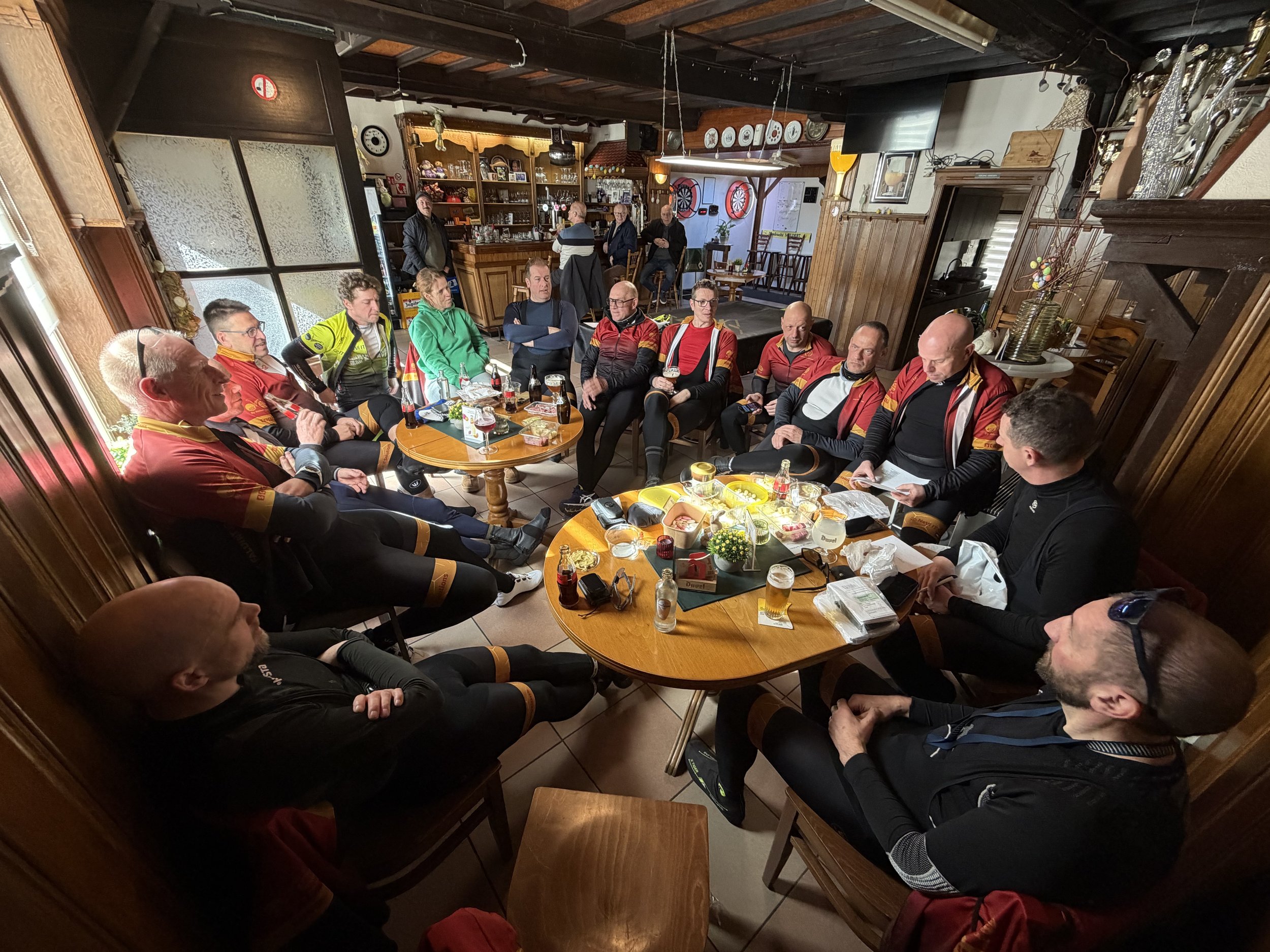 Op de terugweg met de wind schuin in de rug steeg het tempo zienderogen en aan het Waterkasteel in Moorsel scheurde er zich vooraan een groepje af die nog eens het snot uit de neus wilden rijden. Joris deed tot tweemaal toe een chasse-patate en werd weergepakt door de achtervolgende groep. Bij aankomst bij Ingrid bleken de President en de Scalle tot ieders angst verdwenen. Maar na een tiental minuten daagden zij op met tassen vol gevuld met allerlei versnaperingen. Jean had ondertussen nog maar eens zijn tijger losgelaten en grolde als een krolse kat als hij Ingrid zag in haar strakke “lederhosen” en topje met luipaardprint. Zijn gedachten dwaalden onmiddellijk af naar een filmklassieker “Ilsa Wolvin van de SS” waar Ilsaken veelvuldig haar “karwats” deed nederdalen op menig mannelijk lid. Het was duidelijk dat Patriciaken deze zondag Jean niet kwam ophalen of hij zou anders minder praat op gehad hebben.