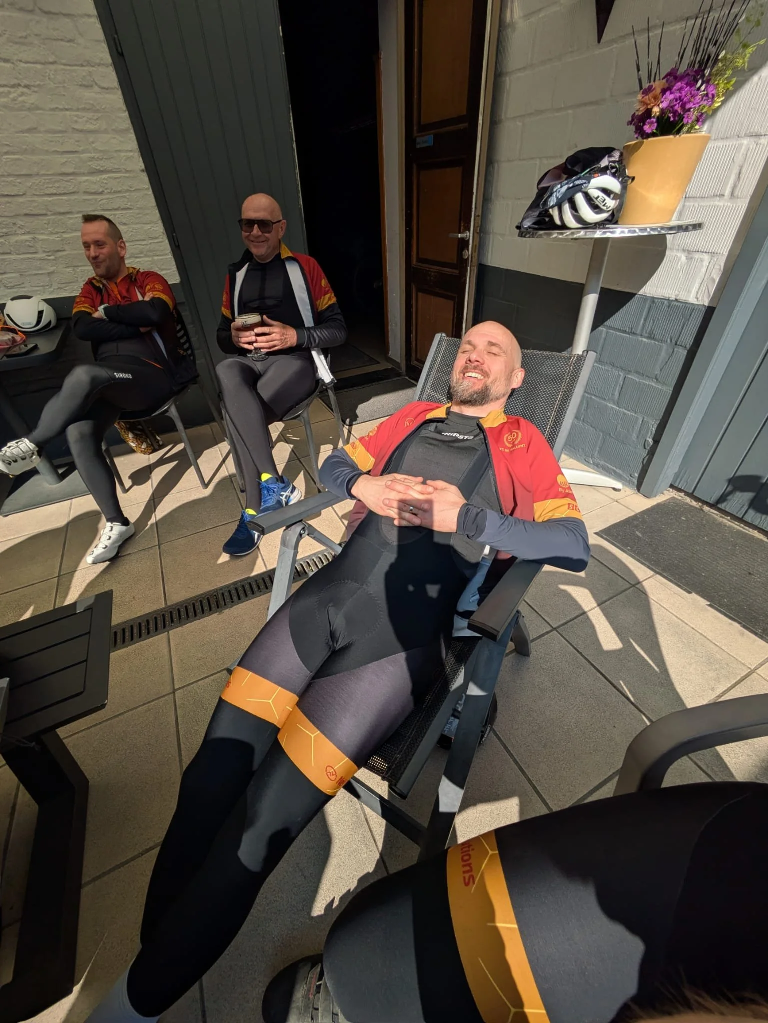 Na de afdaling van de drukke Parklaan werd via de Beukendreef naar de Affligemdreef geklommen en was het de bedoeling om eens allemaal samen te arriveren. Alleen had Bill het niet zo goed begrepen, en nog in de roes van zijn overwinning op de quiz van zaterdagavond, demarreerde hij op het steilste stukje Dreef. Peter kon niet nalaten van te demarreren en Jos, vloog er ook achter. Kris zou achteraf zeggen dat de poging om samen te blijven toch wel een zeven op tien verdiende. Peter heeft bij aankomst eerst nog een kwartiertje in de hoek moeten staan ingevolge zoveel rebellie en zijn eerste cola moest hij ook overslaan. Jos nam genoegen met een heel klein glaasje water.