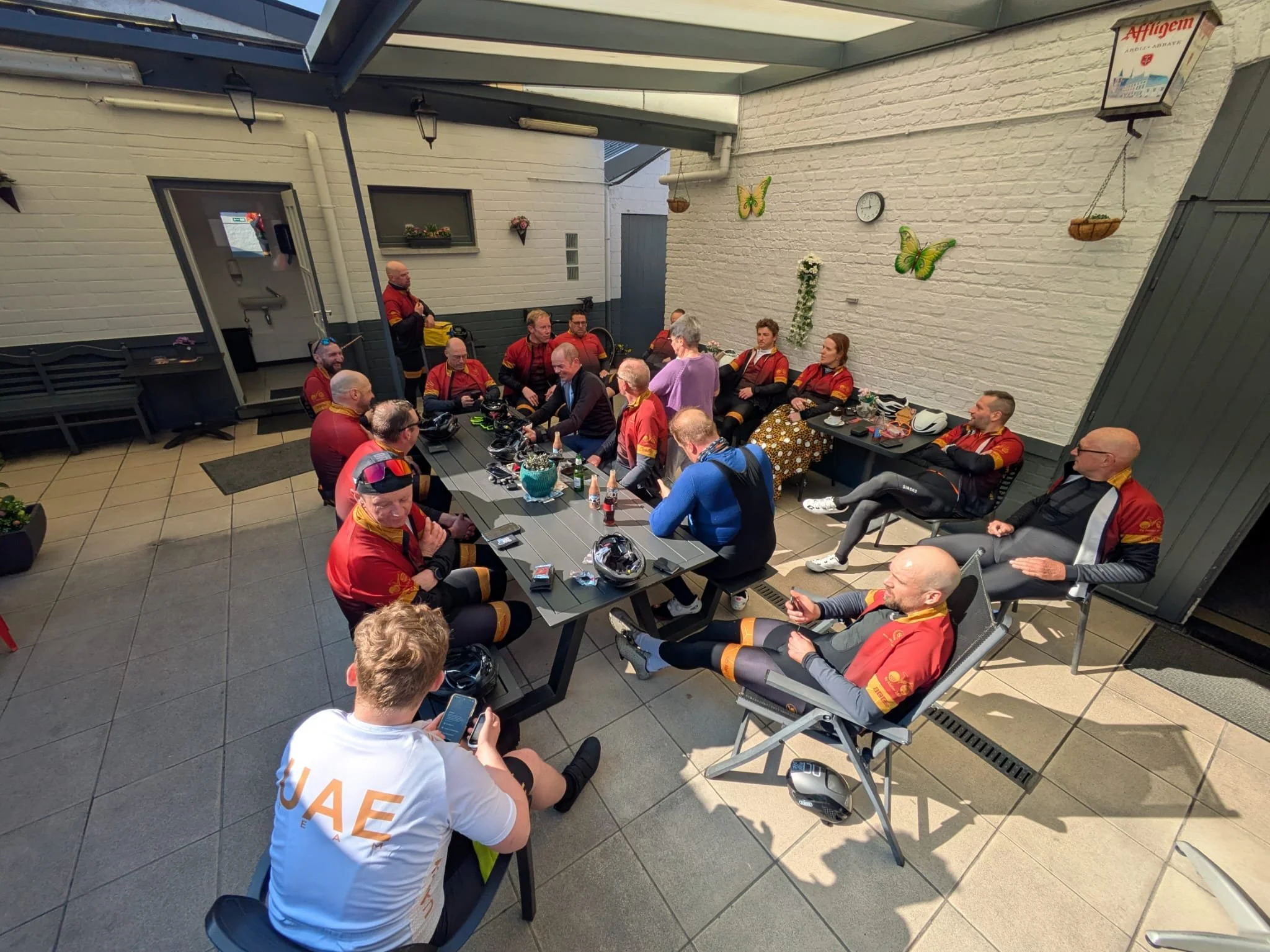 Vanuit de Dendervallei in Zandbergen mochten we van Jo-parcours nog eens uit de put klimmen en weer zakte mijn zadelpen onder het vriespunt en mijn poging om met de eersten boven te zijn, werd dan ook in de kiem gesmoord op mijn kinderfietsken. En aangezien ik niet over de benen van Pogacar beschik, kon ik ook het peloton niet meer inhalen om te zegevieren na de Poggio. Een tweede noodhulpstop drong zich op en eens te meer werd de zadelpen hemelwaarts getrokken. Gelukkig kon ik nu wel de rit vervolledigen zonder dat ik leek op een hond die zijn gat aan de mat schuurt. Via Okegem raakten wij in Welle waarna wij nog een mijn inziens toch wat overbodig lusje maakten via Terjoden en Nieuwerkerken, om toch iets van kritiek op het parcours te hebben.