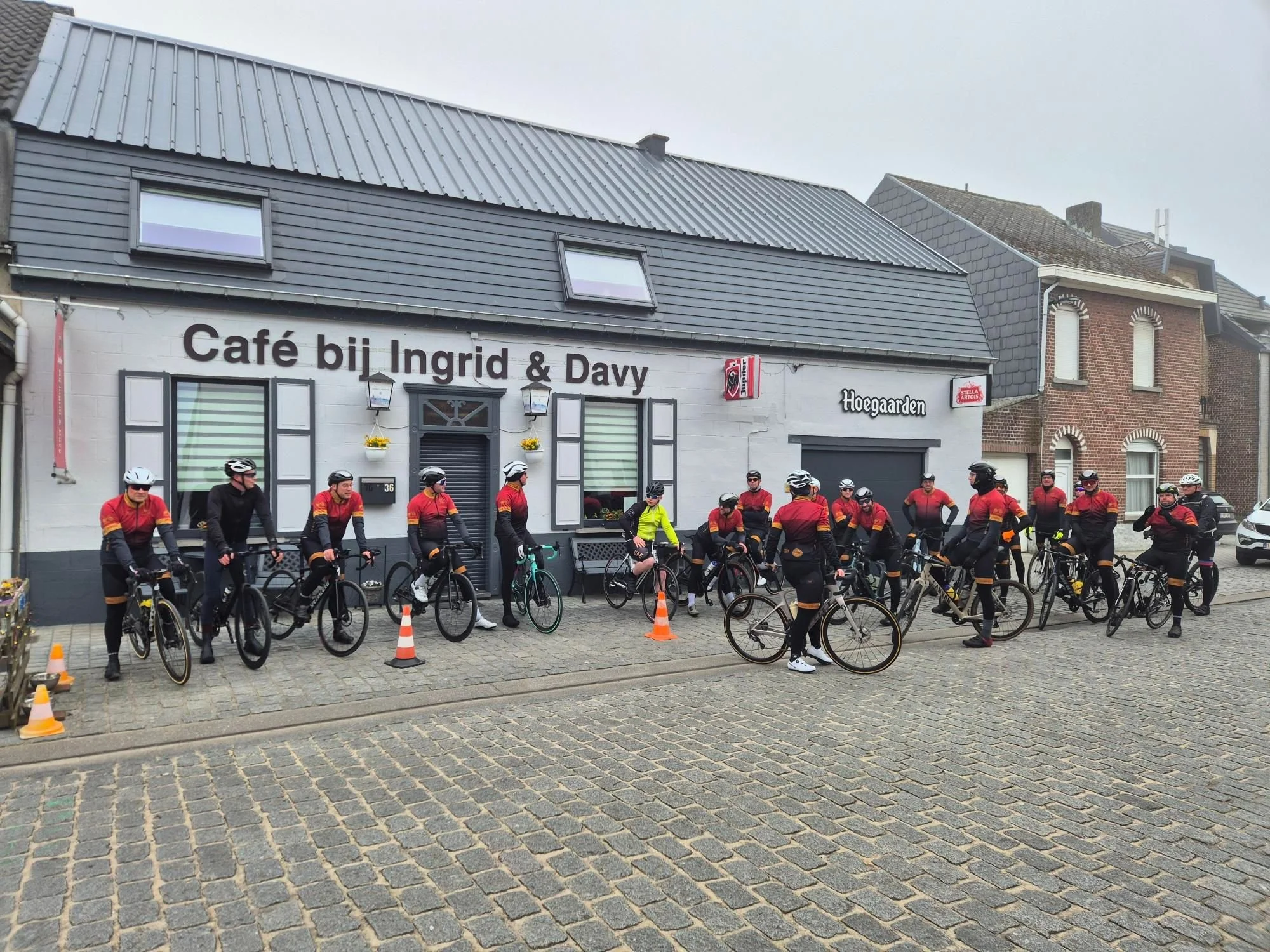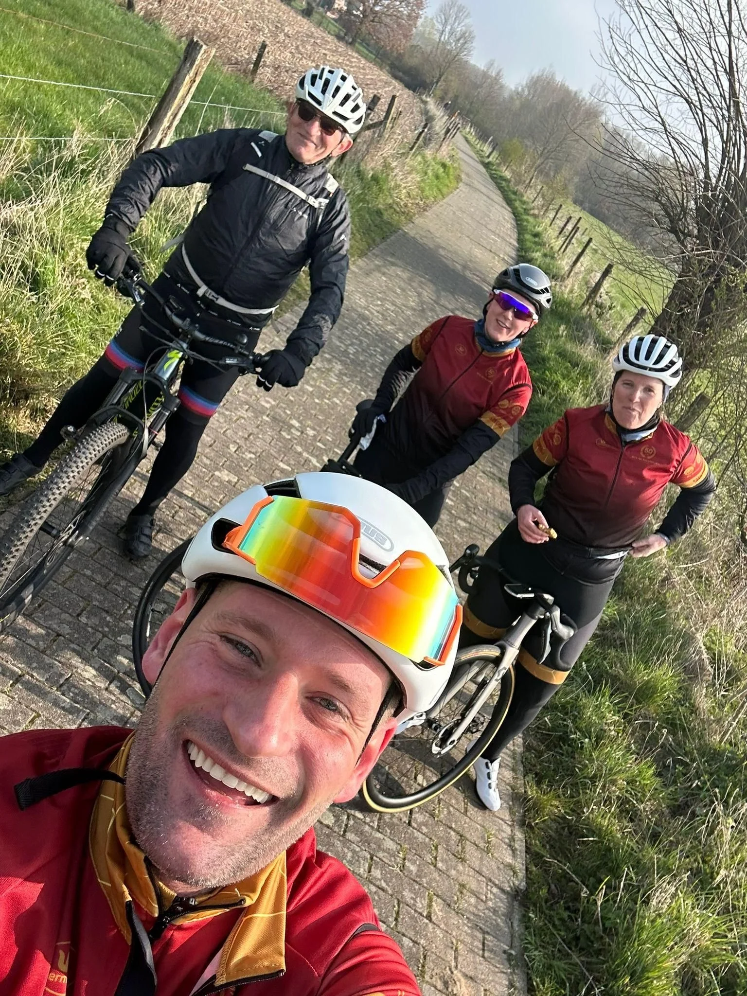 Over naar de orde van de dag, onder de 23 aanwezigen ook 4 leden van het B-Team. Dirk nam Yentl, Els en debutant van het seizoen, Glenn mee op sleeptouw. Dit viertal werd gegangmaakt door het bijna 78-jarige oud-lid Freddy die op vraag van Yentl zijn elektrisch ondersteunde mountainbike had opgeladen en die geheel belangeloos het kwartet uit de wind kwam zetten. De 19 anderen trokken zonder sherpa’s richting Congoberg. En een groep van 19 fietsers is eerlijk gezegd al redelijk imposant om te zien voorbijfietsen. Menig voetganger bleef dan ook even staan om onze groep te monsteren, en vooral onze nagelnieuwe, high-end uitrusting oogde blijkbaar veel bijval, want menig mond van de toeschouwer viel gewoon open van stomme verbazing. Misschien was het ook wel een beetje omdat Pieter meefietste, die ook debuteerde dit seizoen, en misschien ook wel van de twee vorige seizoenen. Maar joviaal als wij zijn, wordt daar met geen woord over gerept é. Hij had dan ook een geldig excuus aangezien hij vandaag pas de eerste keer op penitentiair verlof mocht na zijn aanvaring met een lange arm der wet.
