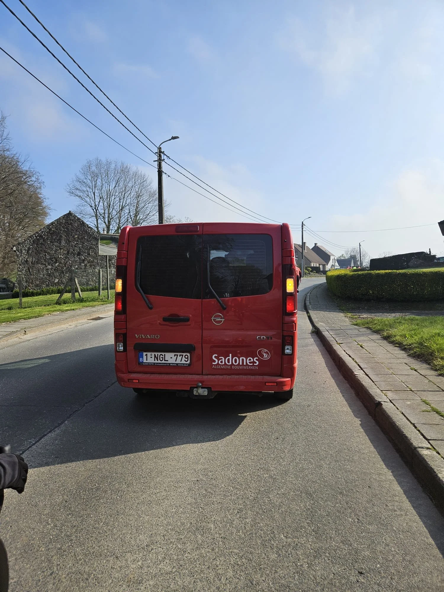 Jo verraste alles en iedereen van bij het begin van de rit want, het traject dat hij had uitgetekend was ongezien, zelfs ongefietst. Hier en daar werden korte lussen doorspekt met nijdige hellinkjes, en werden er wegels aangedaan waar wij nooit eerder kwamen, misschien was het wel omdat ze niet echt geschikt waren voor een koersfiets, maar er kloeg niemand - naar het schijnt is “klaagde” nu trouwens ook correct Nederlands. De eerste echte helling was Berchembos, waar er op de kop al eens deftig aan de bel werd getrokken zodat er achteraan al een eerste protje vanonder het zeemvel ontsnapte. Gelukkig konden we daarop de Woestijn naar beneden fietsen recht naar de Drie Egypten - een naam die ik nooit heb begrepen aangezien er maar één Egypte is - maar door al dat woestijnzand moeten er zich toch wel wat schurende korrels in mijn zadelbuis hebben genesteld. Stilaan begon ik dan ook hoogte te verliezen en weg te zakken tot op het spreekwoordelijke niveau van de President en De Scalle. Een eerste depannagestop drong zich op op de top van de mooie en lange Kasteelstraat. Ondertussen kwamen mijn knieën bij het trappen al ter hoogte van mijn oren. Met wat commentaar en hoongelach, wellicht puur uit “jaloezeriederoi”, was dit korte oponthoud snel voorbij. Op naar de Congoberg, waar ooit koppensnellers de bossen onveilig maakten, en waar nu enkel over de kinderkopjes wordt gesneld komende vanuit Winnik. Maar ook hier wist Jo ons te verrassen door via één der zijkanten de berg aan te vallen, en voor we het wisten, waren we boven, het was dan ook de makkelijk beklimbare kant. Voor de fun doken we niet lang daarna de Dendervallei in, maar niet voor we opgehouden werden door een camionette van Sardonis, u weet wel, dat addergebroed uit de top-detectiveserie Merlina. Die waren daar gewoon vanuit hun camionette een wielertoerist aan het proberen door het passagiersraampje te trekken!!! Maar toen ze ons peloton zagen komen, staakten ze maar snel hun snode plannen en weg waren ze.