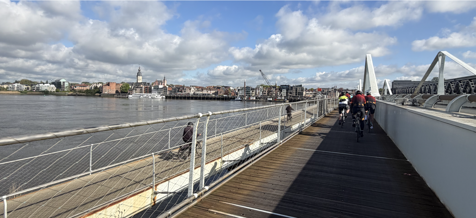 In ieder geval, zondag zou de parcoursbouwer ons mild gezind zijn en een vlakke rit voor ons uittekenen. Ware het niet dat een vlakke rit ook een iets langere afstand betekent en dat het tempo zeker en vast de hoogte zal inschieten. Normaal heb je tijdens een ritje als schrijver van het verslag even de tijd om te mijmeren en alles rustig op te nemen in de grijze massa om het daarna neer te pennen, maar deze keer was er hier geen sprake van. Het startschot was nog maar gegeven of Stefano Di Longo en Carsten, de jongste welp uit de kudde, namen de leiding in handen en demarreerden nog voor de Putstraat als een bende losgelaten Hollandersop de pannenkoekenboot. Op de enige echte hoogtemeters van de dag zouden zij strijden voor de bergpunten en de bijhorende bolletjestrui. Het antwoord wie uiteindelijk de punten op zijn conto mocht schrijven, moet ik u jammer genoeg schuldig blijven. Ik was de prut nog uit mijn ogen aan het wrijven, en zij waren al in de Groenstraat. Tot Buggenhout was het nog een gezapig tempo, maar eens voorbij Sint-Amands werden de duivels zeker ontbonden. Als trouwe WTC-volger weet u dat wij binnenkort een bedevaartstocht gaan ondernemen van Meldert naar Toulouse. Ik heb geen angst om Toulouse te zien en te sterven, maar de meeste angst wordt mij ingeboezemd dat ik Toulouse moet bereiken met deze athleten. Stilaan tekenen zich bij sommigen de aders op de benen af, worden vatjes veranderd in six-packs en gereden kilometers worden steevast uitgedrukt in centuries terwijl bij mij eerder een gaatje meer moet gemaakt worden in de broeksriem en mijn cupmaat van B naar C verandert. Temse was ons keerpunt en via Tielrode en Hamme bereikten we vliegensvlug Denderbelle. Net voor we de Bellebroeken zouden indraaien, moesten we nog halt houden aan een gesloten overweg. Het is te zeggen, enkel Carsten moest halt houden aan de overweg. Wij waren met ons achterwiel net over het laatste spoor, als het belsignaal ons verwittigde dat de trein naar Oostende kwam aangestormd. De trein raasde voorbij en wij trokken ons terug op gang om de laatste kilometers van onze tocht af te werken. Plots draaide Peter zich om en riep hij nog enkele woorden naar ons waar wij geen deftige zin mee konden bouwen. Later bleek dat hij stopte om even dag te zeggen bij een ex-collega was die hij al jaren niet meer gezien had. Omalle onduidelijkheid, duidelijk te maken werd er even halt gehouden zodat Peter veilig en wel kon aansluiten maar waarbij Carsten zo traag reed, dat hij kantelde. Ja, eens de snelheid in de man is, is traagheid fataal. Meer dan wat jeugdig vel op het asfalt en den bast van de knie, hield hij er niet van over. We zullen hem bij thuiskomst wel in de goede handen van Ingrid duwen om hem de eerste hulp toe te dienen. Ingrid zelf zou er wel geen probleem van maken om nog eens over jonge en zachte benen te strijken. Ze voelde er zichzelf ook twee keer zestien jonger door. Eens voorbij het voetbalveld van De Vlugge Jongeren van Baardegem werden we begeleid door de plaatselijke wijkagent. Hij zorgde ervoor, dat met zijn aanwezigheid achter ons, geen enkele auto ons rakelings zou voorbijsteken. Een beetje veiligheid op de baan cannoo(i)t kwaad….Voor alle zekerheid namen we aan drankencentrale Nuelant toch maar mooi het fietspad, je weet maar nooit.